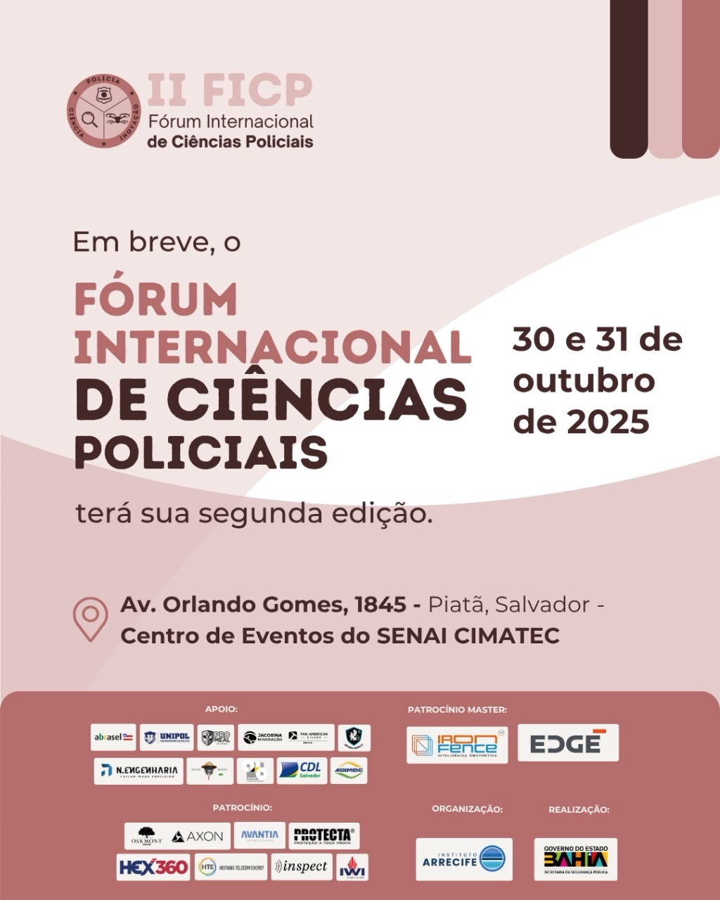 Nos dias 30 e 31 de outubro, a capital baiana será palco do II Fórum Internacional de Ciências Policiais (FICP Bahia 2025), realizado pela Secretaria da Segurança Pública do Estado da Bahia (SSP-BA) e pelo Governo do Estado da Bahia, com organização científica do Instituto Arrecife.
