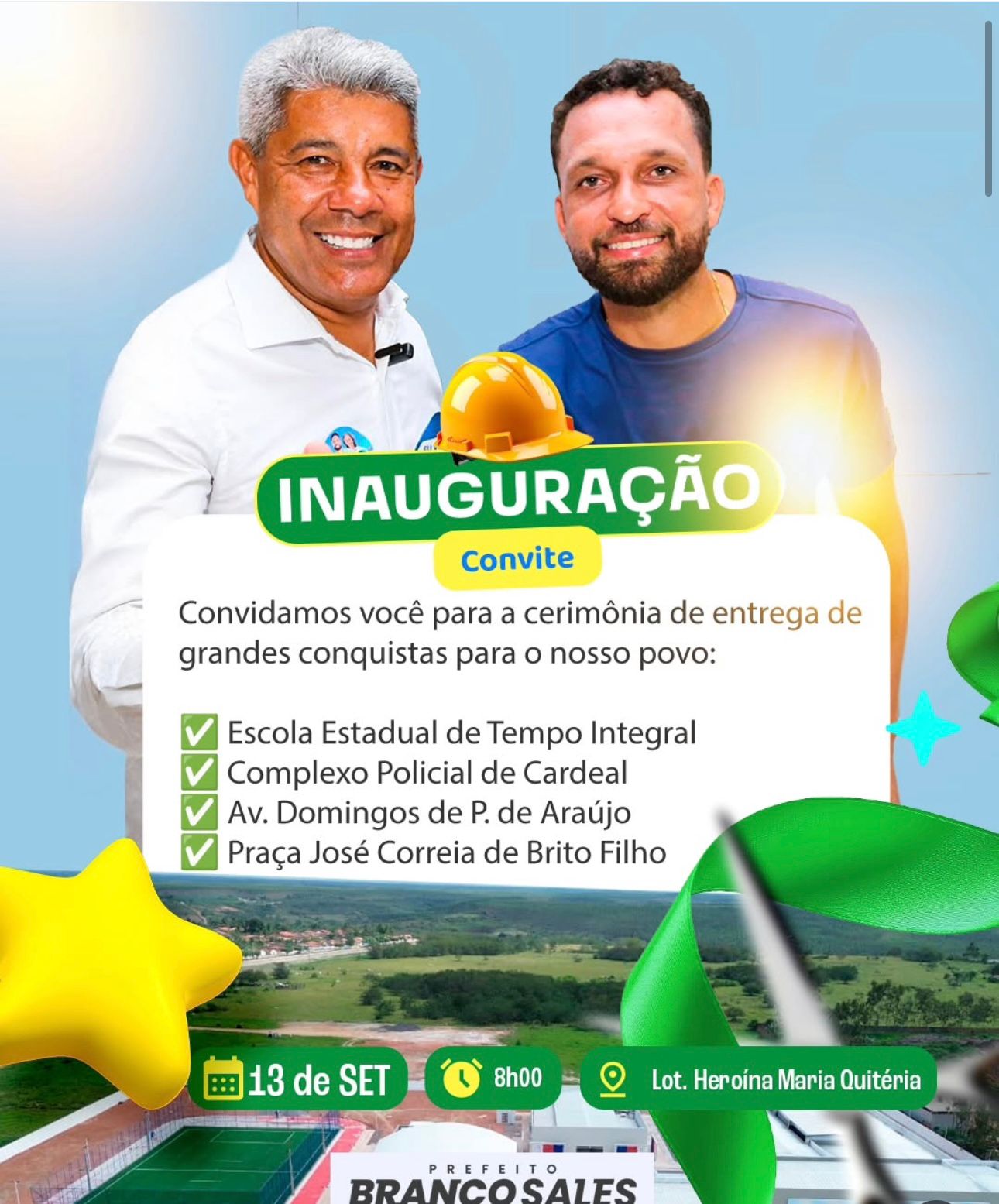 Na próxima sexta-feira (13), às 8h, o município de Cardeal da Silva, no Litoral Norte da Bahia, será contemplado com um importante conjunto de entregas do Governo do Estado. A cerimônia contará com a presença do governador Jerônimo Rodrigues e marcará um momento histórico para a cidade, com inaugurações que fortalecem a educação, a segurança, a mobilidade urbana e os espaços de lazer.