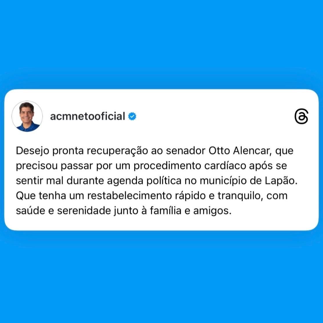 “Desejo pronta recuperação ao senador Otto Alencar, que precisou passar por um procedimento cardíaco após se sentir mal durante agenda política no município de Lapão. Que tenha um restabelecimento rápido e tranquilo, com saúde e serenidade junto à família”, afirmou ACM Neto.
