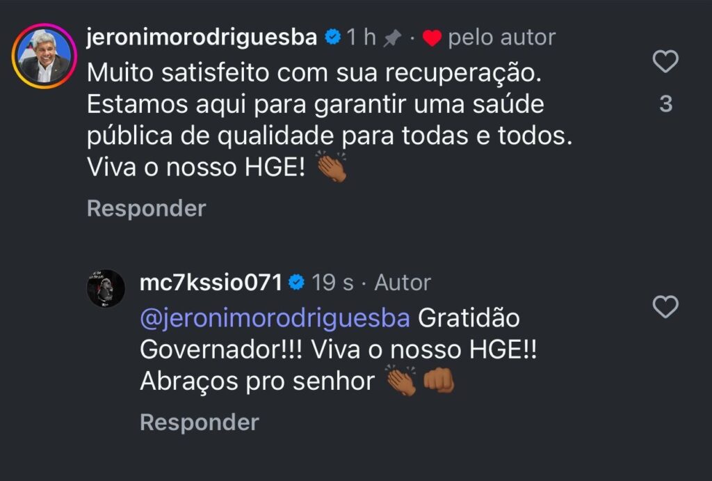 Nos comentários de uma publicação feita pelo artista no Instagram, Jerônimo afirmou estar “muito satisfeito” com a evolução do quadro de saúde do cantor e reforçou o compromisso do governo com a oferta de uma saúde pública de qualidade. “Estamos aqui para garantir uma saúde pública de qualidade para todas e todos. Viva o nosso HGE!”, escreveu o governador.