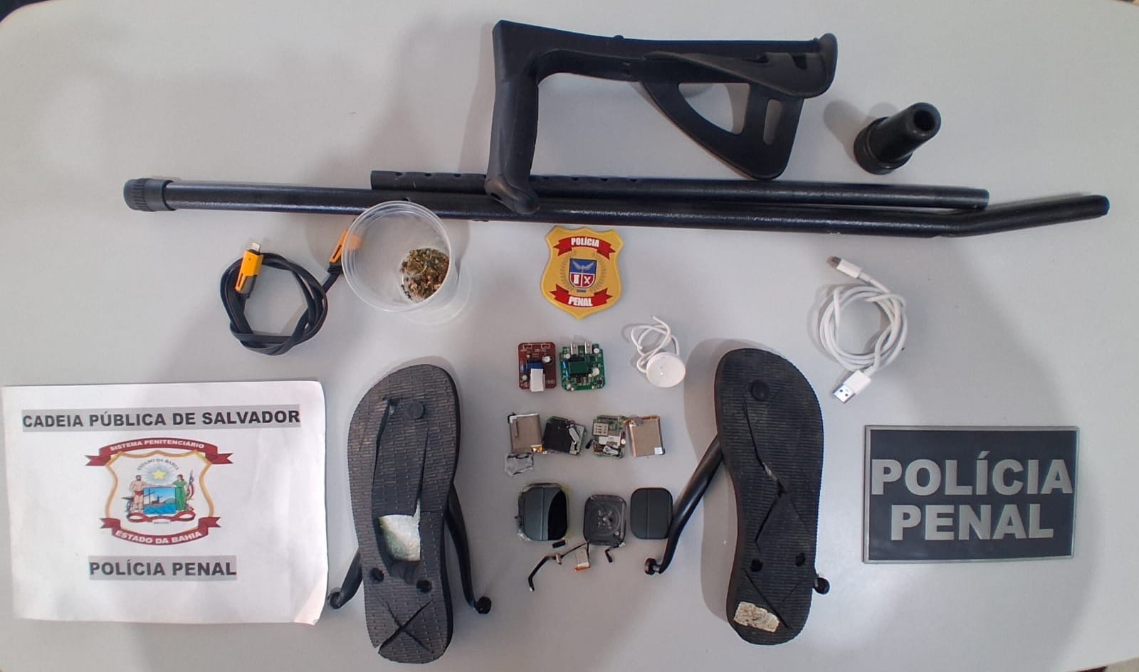 No intuito de burlar a fiscalização, a visitante escondeu o material ilícito dentro de uma muleta e no par de sandálias. A farsa foi descoberta assim que a mulher entrou no equipamento. De imediato, as imagens acusaram os ilícitos.