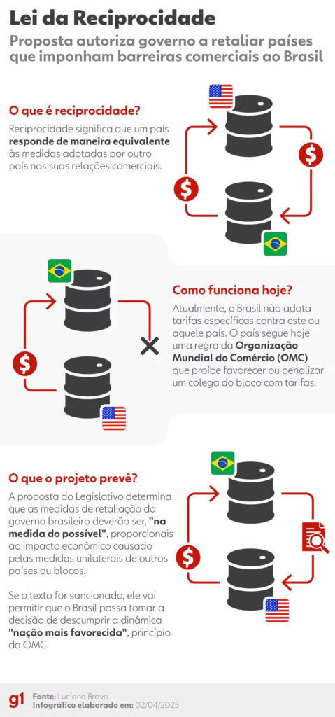 O presidente Luiz Inácio Lula da Silva (PT) disse que responderia às taxas anunciadas do governo americano usando a Lei de Reciprocidade Econômica, sancionada por ele em abril. O texto foi aprovado nas duas casas com apoio tanto de governistas quanto da exposição.