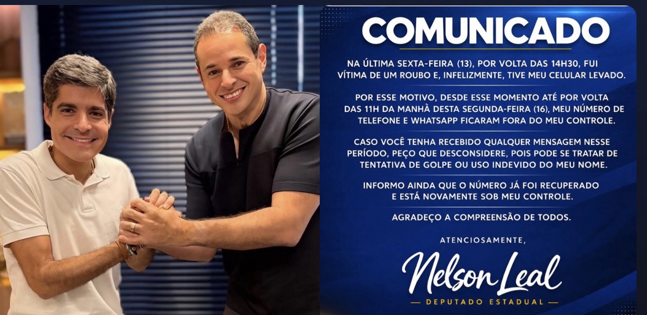 “Na última sexta-feira (13), por volta das 14h30, fui vítima de um roubo e, infelizmente, tive meu celular levado. Por esse motivo, desde esse momento até por volta das 11h da manhã desta segunda-feira (16), meu número de telefone e WhatsApp ficaram fora do meu controle. Caso você tenha recebido qualquer mensagem nesse período, peço que desconsidere, pois pode se tratar de tentativa de golpe ou uso indevido do meu nome”, declarou.