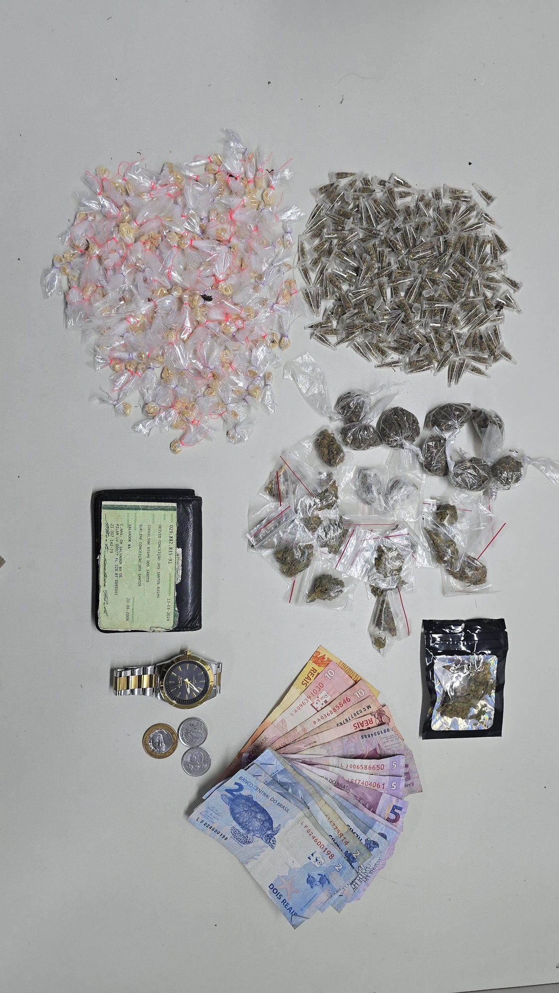 NO local foram encontrados 214 pinos de k9, 178 pinos de crack, 27 porções de maconha, dinheiro em espécie, um relógio e uma carteira.