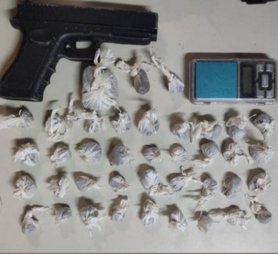 Ao chegarem ao local, a guarnição localizou o indivíduo, realizando a abordagem. Foram encontrados com o suspeito, 40 trouxas de maconha, uma balança de precisão e uma réplica de pistola.