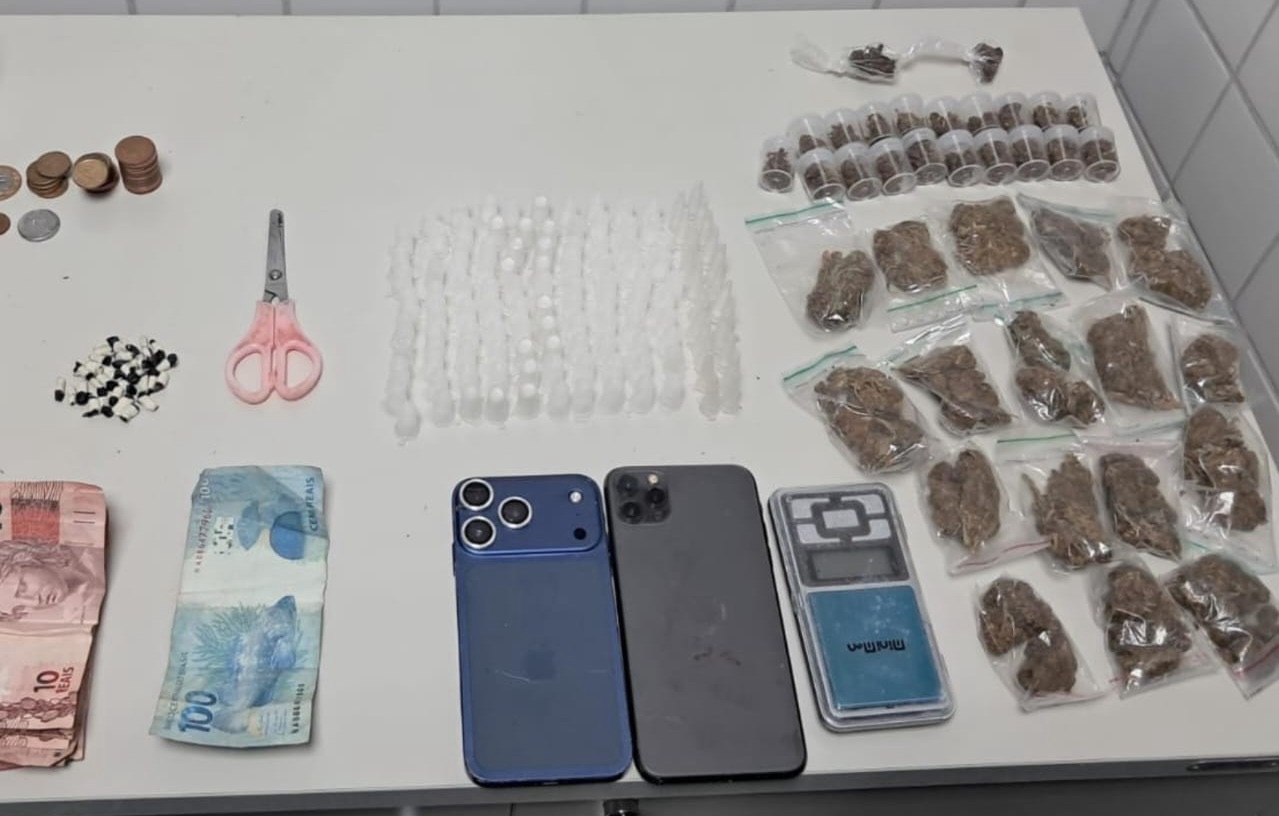 Durante o acompanhamento, dois dos suspeitos foram alcançados e, com eles, foram apreendidos 122 pinos de cocaína, 20 porções de maconha, 32 pedras de crack, dois aparelhos celulares, uma balança de precisão e mais de R$ 250 em espécie..