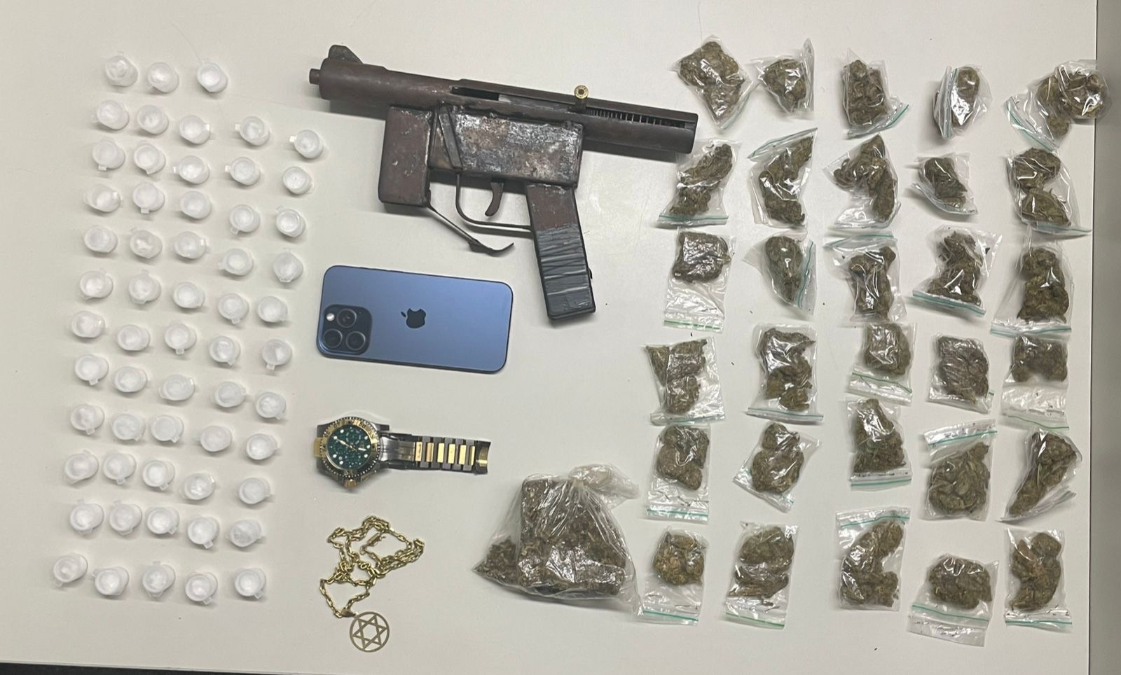 Com o suspeito foram encontrados uma submetralhadora, 31 porções de maconha, 38 porções de cocaína, um relógio, uma corrente dourada e aparelho celular.