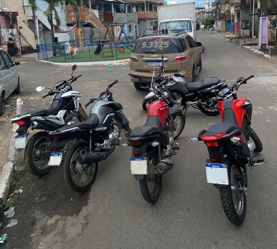 Durante rondas, a guarnição recebeu informações sobre veículos suspeitos na localidade e prontamente realizou a averiguação. Duas motocicletas foram localizadas e apresentadas na delegacia. Ao retornar da apresentação, horas depois, a equipe deu continuidade às buscas e encontrou mais seis veículos com restrição.