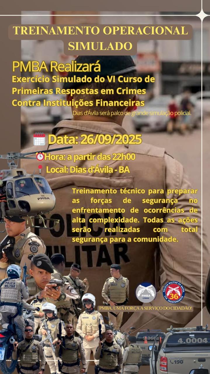 A Polícia Militar da Bahia (PMBA) realizará, nesta sexta-feira (26/09/2025), um Treinamento Operacional Simulado como parte das atividades do VI Curso de Primeiras Respostas em Crimes Contra Instituições Financeiras. O exercício ocorrerá a partir das 22h, no município de Dias d’Ávila – BA, e contará com a participação de diversas unidades especializadas da corporação.