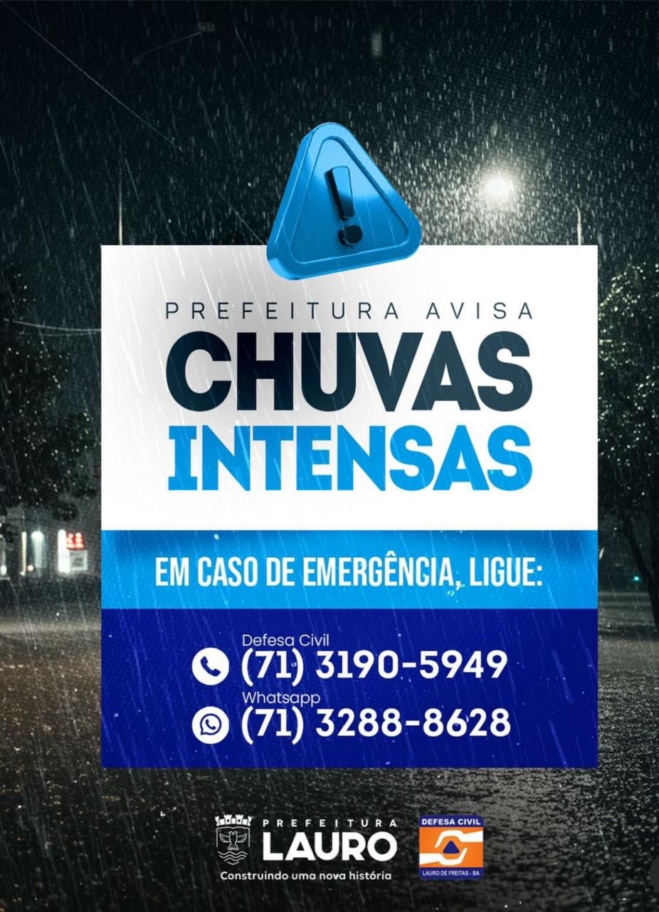 A Prefeitura de Lauro de Freitas, por meio da Defesa Civil, órgão vinculado à Secretaria Municipal de Segurança, Defesa Civil e Ordem Pública (SSPLF), mantém-se em estado de atenção devido às fortes chuvas que atingem o município desde a última terça-feira (11/11). O Instituto Nacional de Meteorologia (INMET) emitiu alerta amarelo para a região, indicando nível de observação.