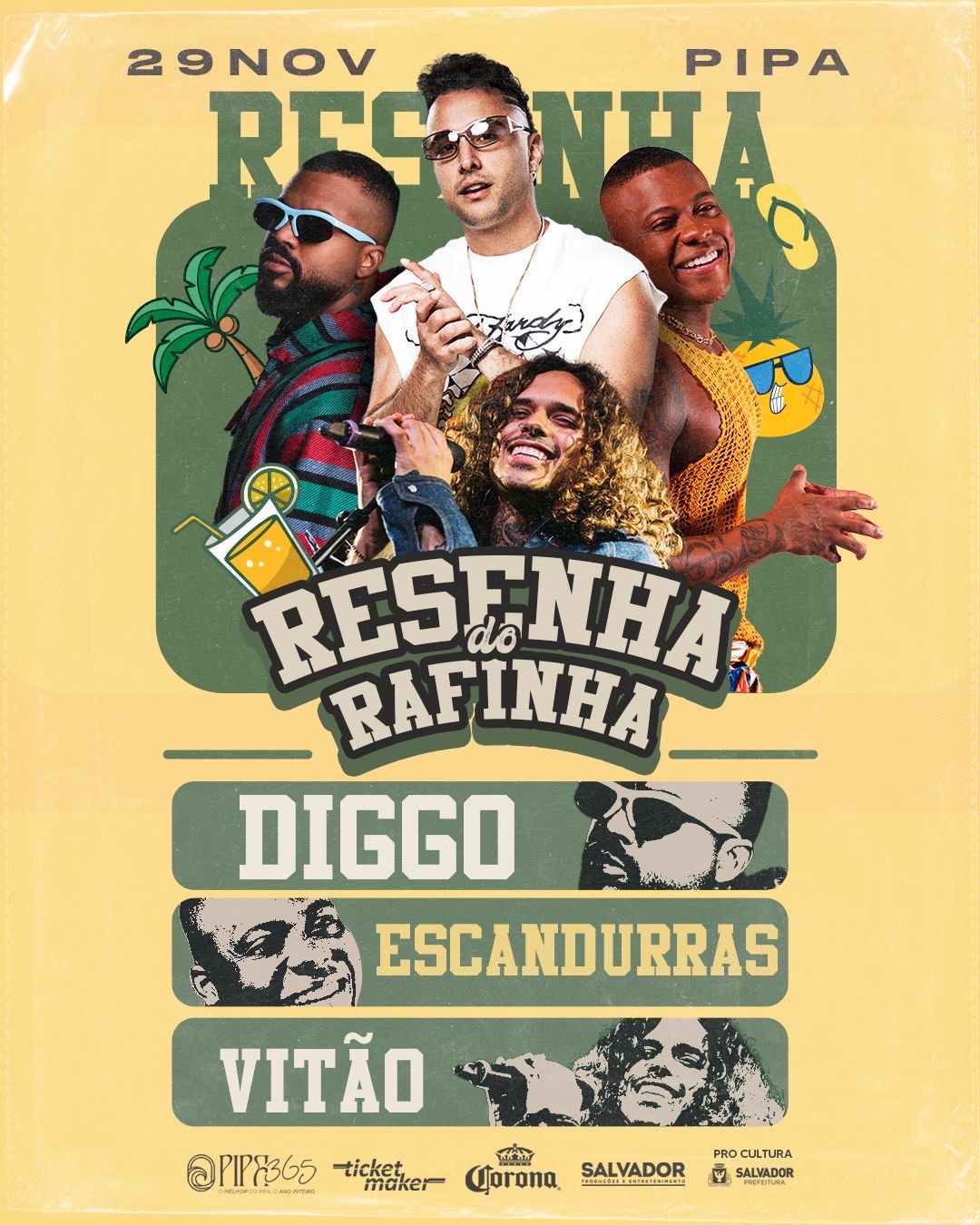 O clima de verão vai invadir a Pipa neste sábado (29). A ‘Resenha do Rafinha’ vai reunir música boa, energia alto astral e uma vibe que só a energia do mar tem! Ao som de Rafinha RSQ, Vitão, Escandurras e Diggo, o evento promete aquecer a região e proporcionar uma mistura de ritmos e sons para o público.