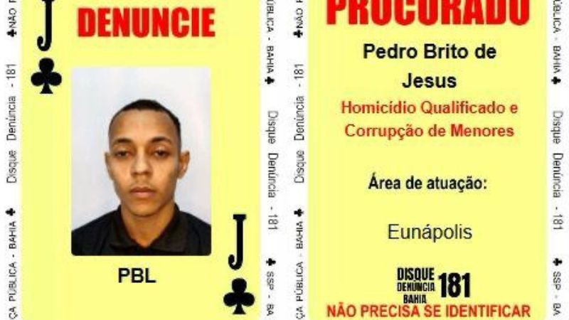 Um suspeito identificado como Pedro Brito de Jesus, apelidado de “PBL”, apontado pela polícia como traficante e autor de homicídios no Extremo Sul da Bahia é o novo Valete de Paus do Baralho do Crime da Secretaria da Segurança Pública (SSP).