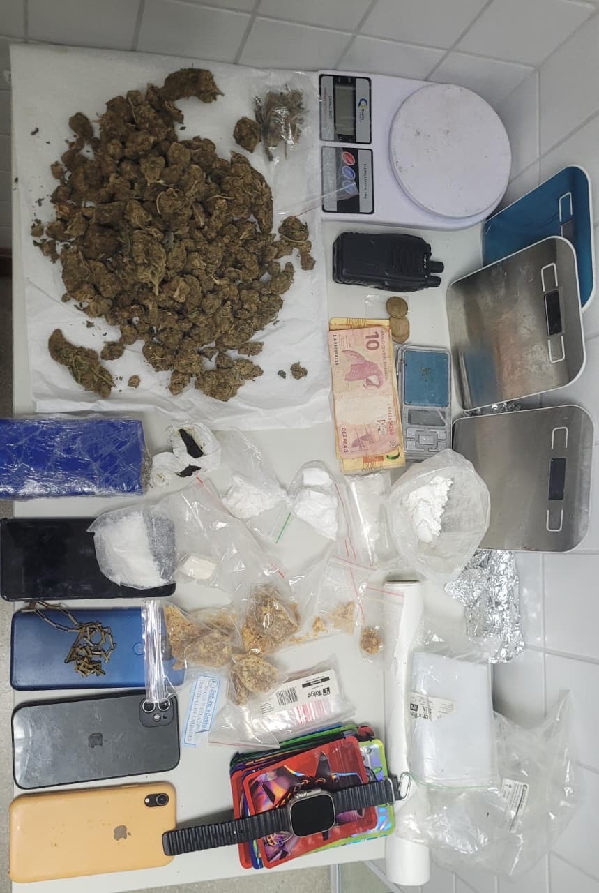 Guarnições faziam rondas quando receberam a informação de que havia homens traficando drogas na localidade. Na chegada da PM, os suspeitos tentaram fugir, sendo que um deles tentou pular um muro e invadir uma residência, mas foi detido. Durante a abordagem, as equipes encontraram com ele porções de maconha, crack, cocaína e haxixe, além de balanças de precisão, um radiocomunicador e material para embalagem. O indivíduo foi identificado como um dos envolvidos no assassinato de um músico, no bairro Novo, em 2024.