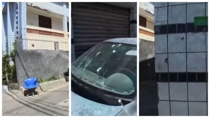 O profissional de imprensa mostrava os prejuízos causados por um tiroteio que havia acabado de acontecer. O confronto entre policiais e traficantes do Comando Vermelho (CV) deixou carros e imóveis danificados.